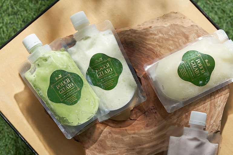 「ポーチジェラート」は、口栓付きのパウチに詰めたタイプ。スプーンを使わずに、片手で楽しめます。厳選した素材の風味を活かして、口どけすっきり、甘さ控えめに仕上げました。場所を選ばないので、外出のお供にもぴったり。ジェラートマエストロが作る本格ジェラートを手軽にお楽しみください。