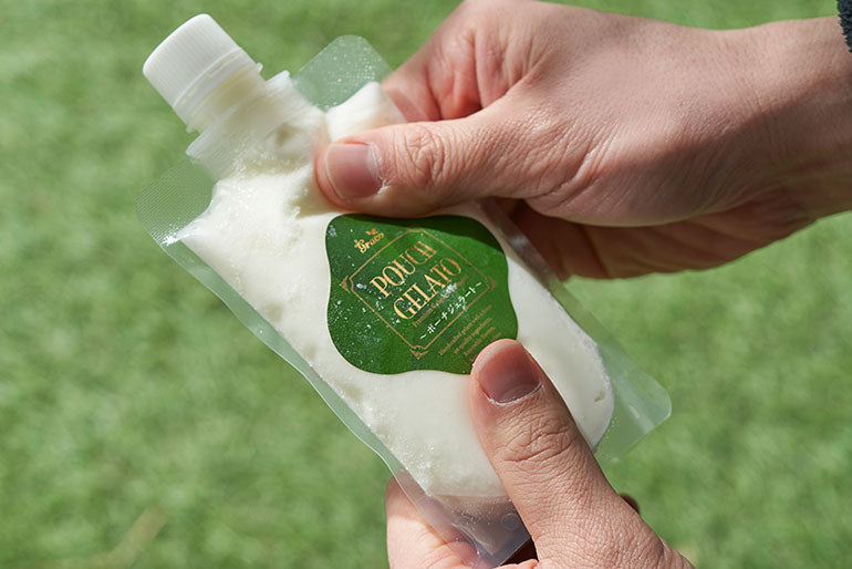 一般的に、ジェラートは作りたての柔らかい状態が一番美味しいのですが、保存している間に固まってしまいます。その点、「ポーチジェラート」なら手で揉むことができます。冷凍庫から出して、常温で10分程度置いてください。少し手で揉めば、お店で食べるようなジェラートに仕上がります。