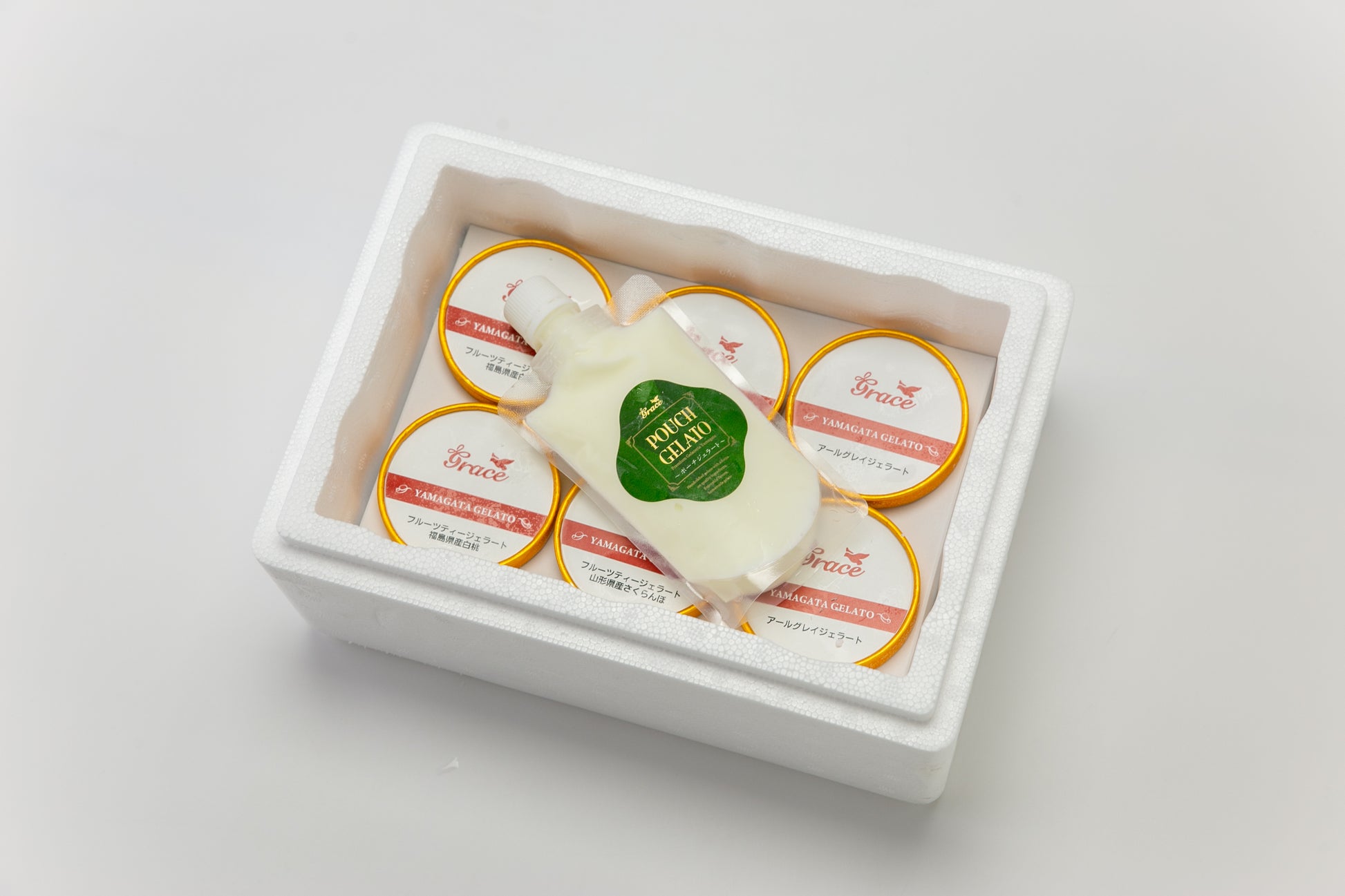 アールグレイジェラート2個、フルーツティージェラート山形県産さくらんぼ 2個、フルーツティージェラート福島県産白桃 2個の計3種6個入り(100mlカップ)。限定特典として、人気ポーチジェラート日本海産塩ミルク130ml1個を「無料プレゼント」でお付けします。