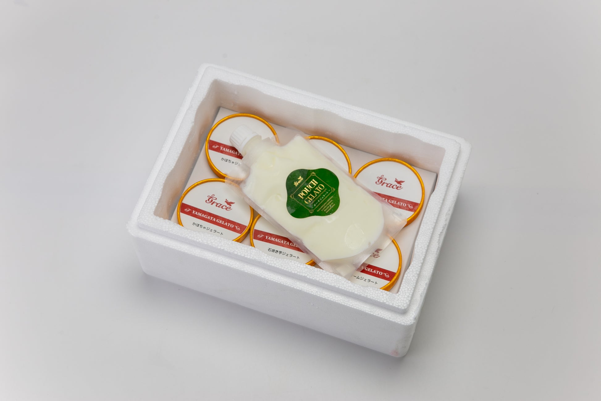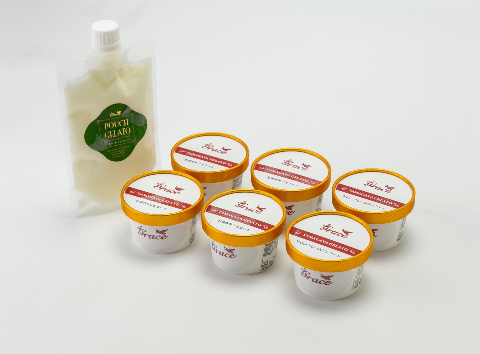 マロンクリームジェラート 2個、かぼちゃジェラート 2個、石焼き芋ジェラート 2個の3種6個入り(100mlカップ)。限定特典として、人気ポーチジェラート日本海産塩ミルク130ml1個を無料プレゼントでお付けします。