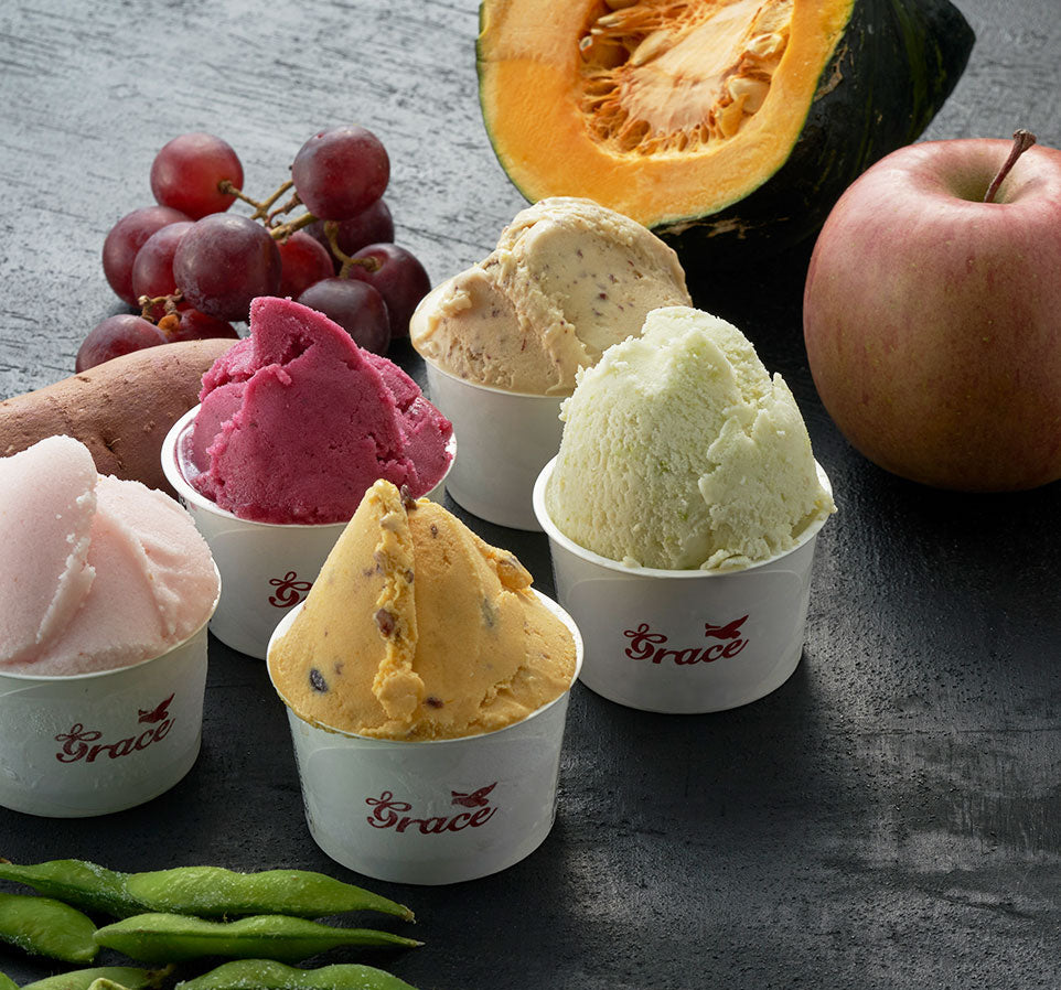 グレイスは、砂糖などをなるべく使用せず、ジェラート自体の甘さを控え、すっきりとした味わいに仕上げています。その理由は、さくらんぼやラ・フランスなどの風味・食感を最大限に活かすため。ジェラートマエストロの小島が、前職のコックの経験を基に、食材に合わせて加工方法を変えています。手間はかかりますが、お客様に「美味しい」と喜んでいただくためには妥協はできません。素材の芳醇な香り、つぶつぶ食感をご堪能ください。